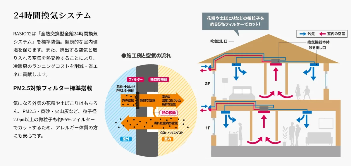 ヤマダホームズの標準仕様では下の図のような24時間換気システムを用いています。 天井に設置された換気口から空気の出入りがあり、24時間の換気を可能にしています。換気口にはフィルターと熱交換機器が搭載されており、黄砂・PM2.5を除去し、室内の温度に近づいた新鮮な空気を循環させることができます。